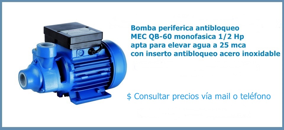 Bombas centrifugas , perifericas , de caudal , para agua limpia , o liquidos agresivos.Potencia desde 0,5 hp monofasicas y trifasicas , normalizadas ,blindadas 100% impulsores en Noryl , bronce ,acero inoxidable , aptas para uso domestico industrial o agricola .