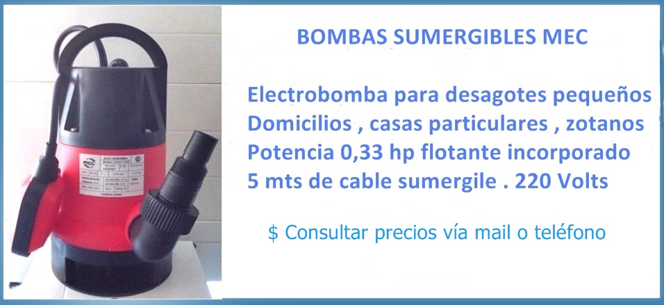 Bombas sumergibles portatiles pluviales , cloacales tratamiento de efluentes monofasicas , con flotante incorporado y trifasicas. Para aguas limpias, pluviales y cargadas, material en plástico , hierro fundido , acero inoxidable con impulsores abiertos o Vortex. Uso domiciliario e industrial , nacionales e importadas.